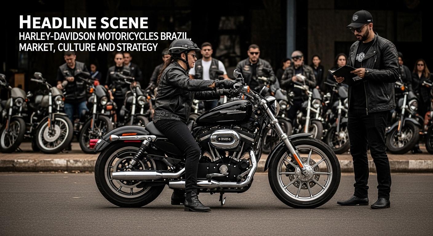 Harley-Davidson motorcycle displayed in a Brazilian urban setting with festive color accents.