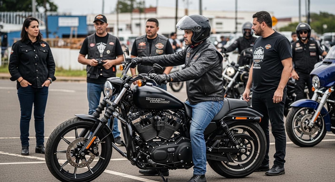 Harley-Davidson motorcycle with Brazilian urban backdrop